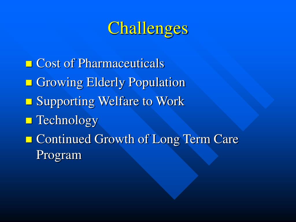 Challenges • Cost of Pharmaceuticals • Growing Elderly Population • Supporting Welfare to Work • Technology • Continued Growth of Long Term Care Program