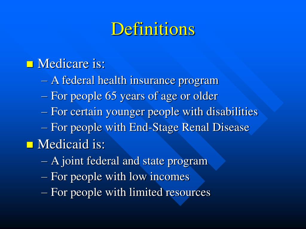 Definitions • Medicare is: • A federal health insurance program • For people 65 years of age or older • For certain younger people with disabilities • For people with End-Stage Renal Disease • Medicaid is: • A joint federal and state program • For people with low incomes • For people with limited resources
