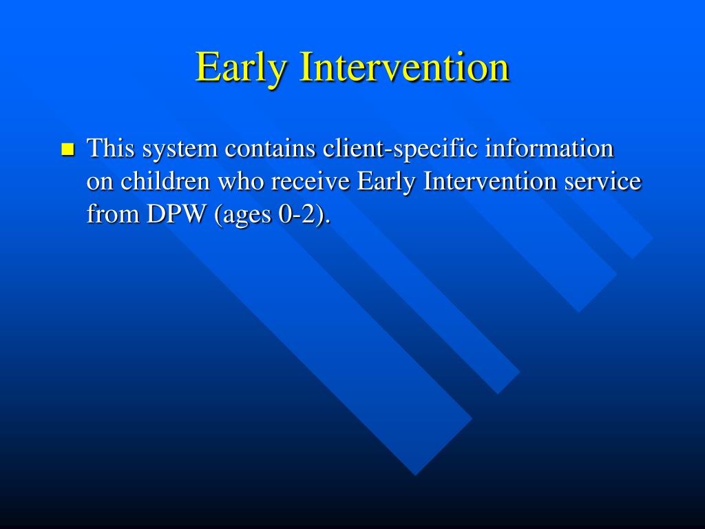 Early Intervention • This system contains client-specific information on children who receive Early Intervention service from DPW (ages 0-2).