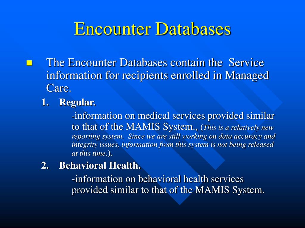 Encounter Databases • The Encounter Databases contain the Service information for recipients enrolled in Managed Care. • Regular. -information on medical services provided similar to that of the MAMIS System., (This is a relatively new reporting system. Since we are still working on data accuracy and integrity issues, information from this system is not being released at this time.). • Behavioral Health. -information on behavioral health services provided similar to that of the MAMIS System.