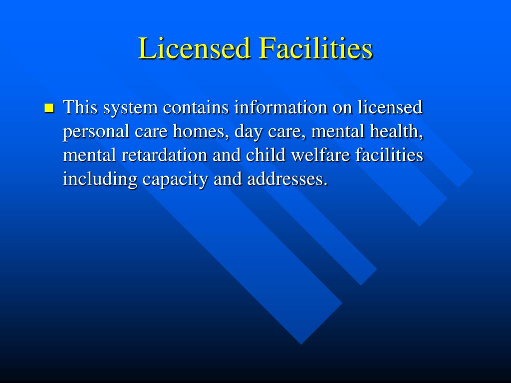 Licensed Facilities • This system contains information on licensed personal care homes, day care, mental health, mental retardation and child welfare facilities including capacity and addresses.