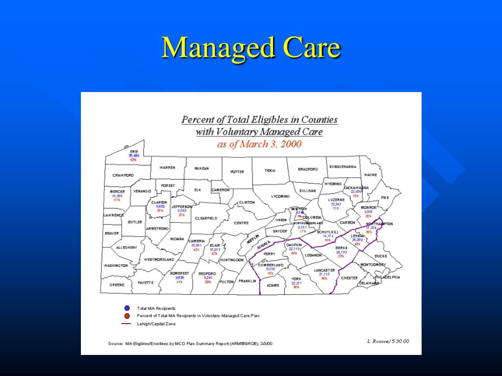 Medicaid Services in Pennsylvania • Two Parallel Delivery Systems: • Fee-for-Service • Managed Care • Voluntary • Mandatory