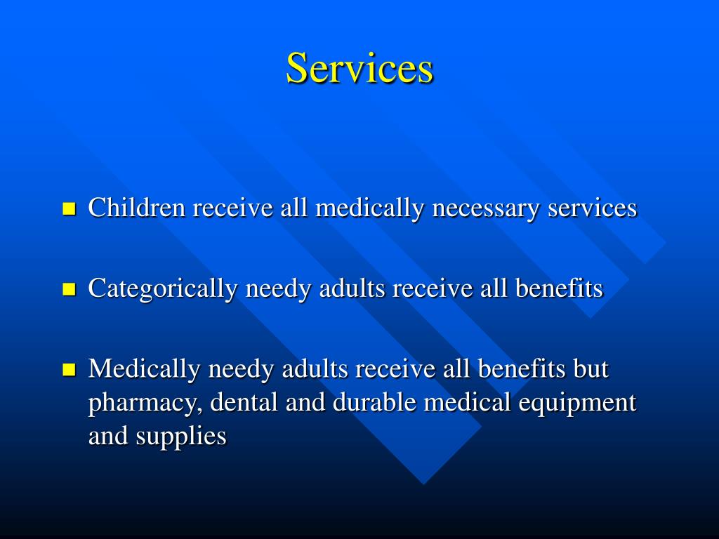 Services • Children receive all medically necessary services • Categorically needy adults receive all benefits • Medically needy adults receive all benefits but pharmacy, dental and durable medical equipment and supplies