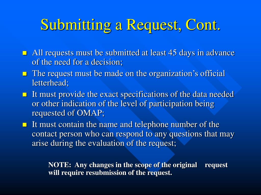 Submitting a Request, Cont. • All requests must be submitted at least 45 days in advance of the need for a decision; • The request must be made on the organization’s official letterhead; • It must provide the exact specifications of the data needed or other indication of the level of participation being requested of OMAP; • It must contain the name and telephone number of the contact person who can respond to any questions that may arise during the evaluation of the request; NOTE: Any changes in the scope of the original request will require resubmission of the request.