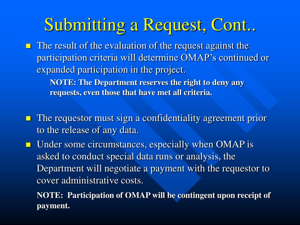 Submitting a Request, Cont.. • The result of the evaluation of the request against the participation criteria will determine OMAP’s continued or expanded participation in the project. NOTE: The Department reserves the right to deny any requests, even those that have met all criteria. • The requestor must sign a confidentiality agreement prior to the release of any data. • Under some circumstances, especially when OMAP is asked to conduct special data runs or analysis, the Department will negotiate a payment with the requestor to cover administrative costs. NOTE: Participation of OMAP will be contingent upon receipt of payment.
