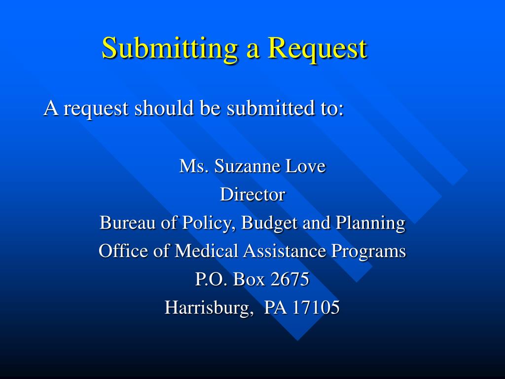 Submitting a Request A request should be submitted to: Ms. Suzanne Love Director Bureau of Policy, Budget and Planning Office of Medical Assistance Programs P.O. Box 2675 Harrisburg, PA 17105