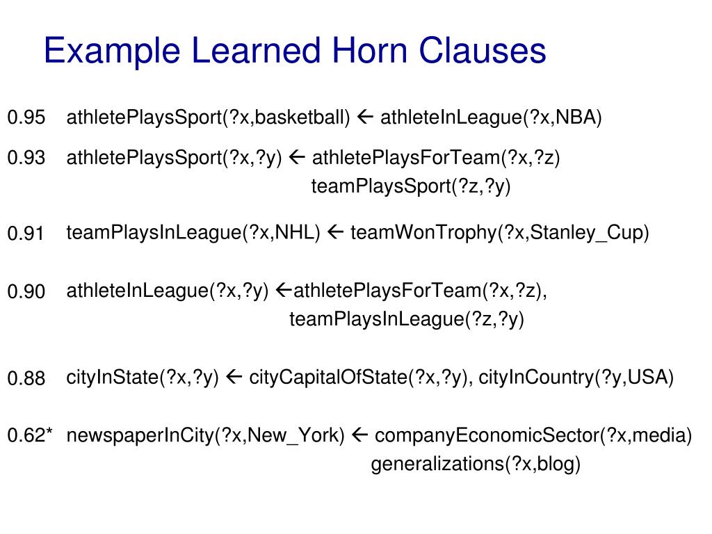 Example Learned Horn Clauses athletePlaysSport(?x,basketball) athleteInLeague(?x,NBA) athletePlaysSport(?x,?y) athletePlaysForTeam(?x,?z) teamPlaysSport(?z,?y) teamPlaysInLeague(?x,NHL) teamWonTrophy(?x,Stanley_Cup) athleteInLeague(?x,?y) athletePlaysForTeam(?x,?z), teamPlaysInLeague(?z,?y) cityInState(?x,?y) cityCapitalOfState(?x,?y), cityInCountry(?y,USA) newspaperInCity(?x,New_York) companyEconomicSector(?x,media) generalizations(?x,blog) 0.95 0.93 0.91 0.90 0.88 0.62*