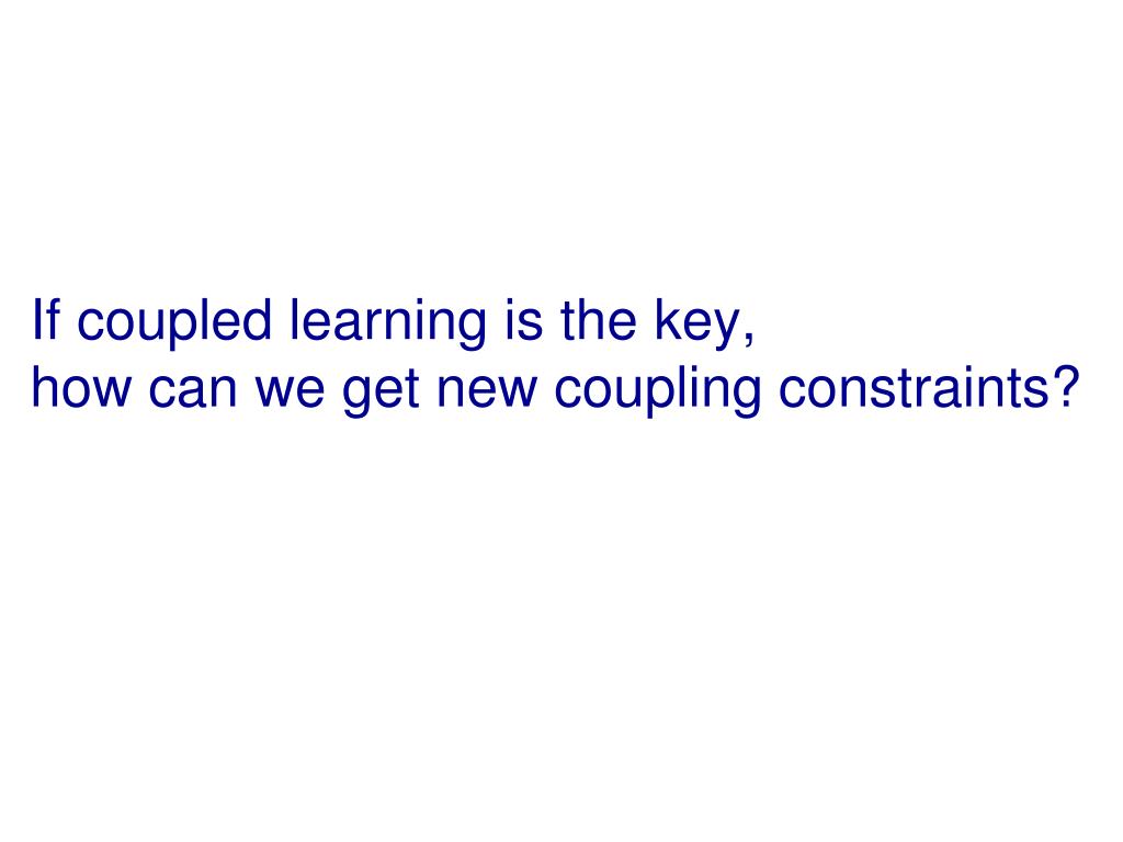 Type 2 Coupling: Multi-task, Structured Outputs [Daume, 2008] [Bakhir et al., eds. 2007] [Roth et al., 2008] [Taskar et al., 2009] [Carlson et al., 2009] person sport athlete coach team athlete(NP) person(NP) NP athlete(NP) NOT sport(NP) NOT athlete(NP) sport(NP)