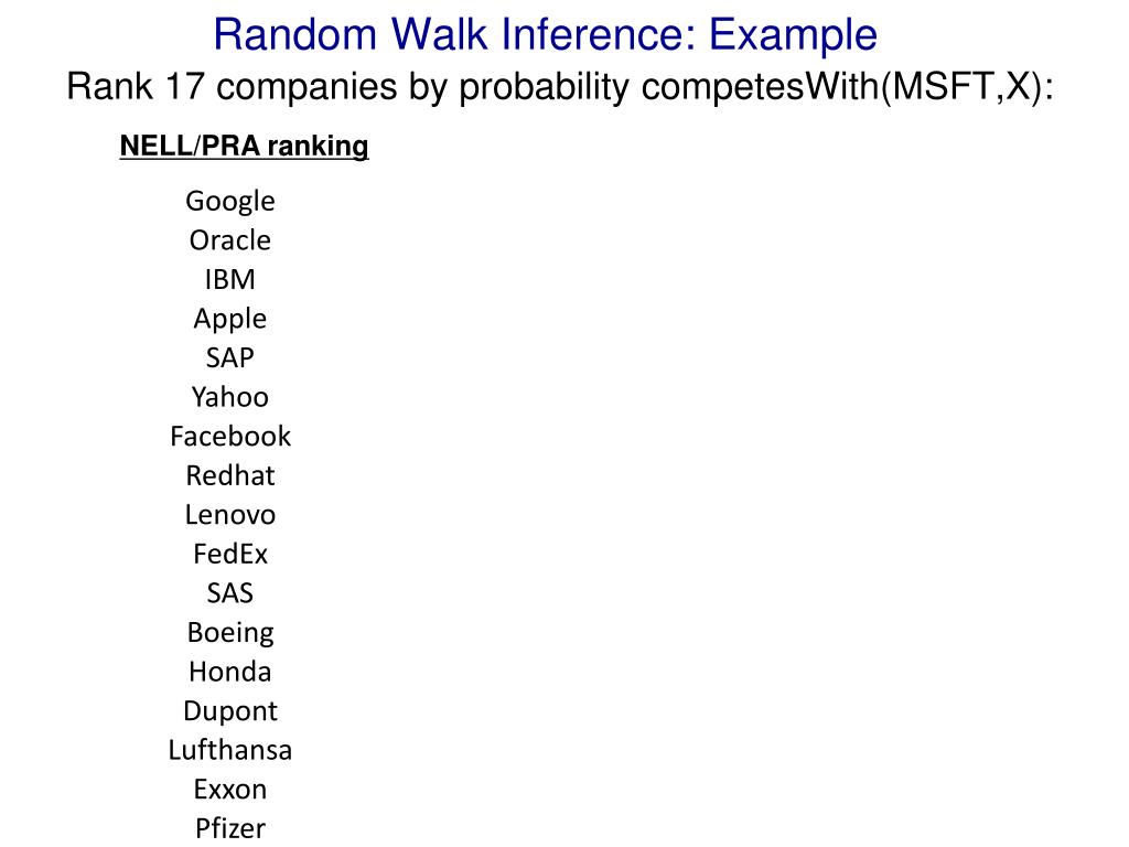Random Walk Inference: Example NELL/PRA ranking Rank 17 companies by probability competesWith(MSFT,X):