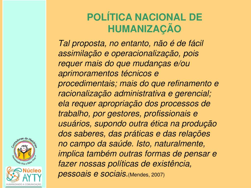 POLÍTICA NACIONAL DE HUMANIZAÇÃO Tal proposta, no entanto, não é de fácil assimilação e operacionalização, pois requer mais do que mudanças e/ou aprimoramentos técnicos e procedimentais; mais do que refinamento e racionalização administrativa e gerencial; ela requer apropriação dos processos de trabalho, por gestores, profissionais e usuários, supondo outra ética na produção dos saberes, das práticas e das relações no campo da saúde. Isto, naturalmente, implica também outras formas de pensar e fazer nossas políticas de existência, pessoais e sociais.(Mendes, 2007)