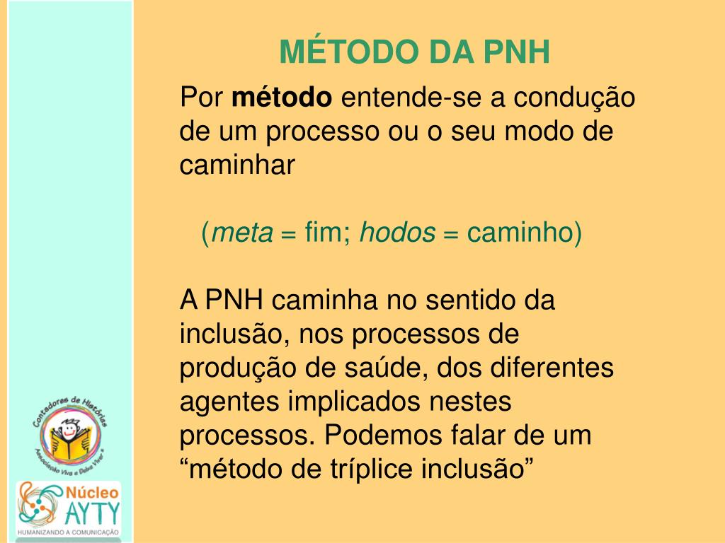 MÉTODO DA PNH Por método entende-se a condução de um processo ou o seu modo de caminhar (meta = fim; hodos = caminho) A PNH caminha no sentido da inclusão, nos processos de produção de saúde, dos diferentes agentes implicados nestes processos. Podemos falar de um “método de tríplice inclusão”