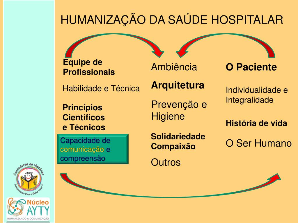 HUMANIZAÇÃO DA SAÚDE HOSPITALAR Equipe de Profissionais Ambiência O Paciente Arquitetura Habilidade e Técnica Individualidade e Integralidade Prevenção e Higiene Princípios Científicos e Técnicos História de vida Solidariedade Compaixão Capacidade de comunicação e compreensão O Ser Humano Outros