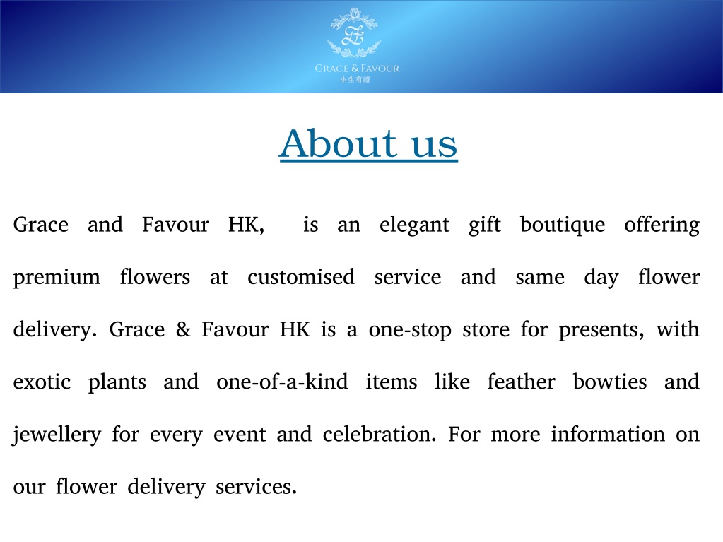 About us Grace and Favour HK, is an elegant gift boutique offering premium flowers at customised service and same day flower delivery. Grace & Favour HK is a one-stop store for presents, with exotic plants and one-of-a-kind items like feather bowties and jewellery for every event and celebration. For more information on our flower delivery services.