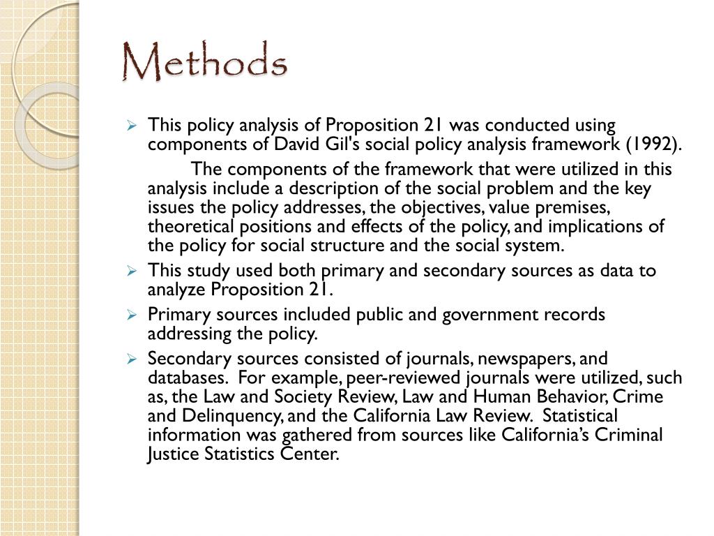 Methods • This policy analysis of Proposition 21 was conducted using components of David Gil's social policy analysis framework (1992). The components of the framework that were utilized in this analysis include a description of the social problem and the key issues the policy addresses, the objectives, value premises, theoretical positions and effects of the policy, and implications of the policy for social structure and the social system. • This study used both primary and secondary sources as data to analyze Proposition 21. • Primary sources included public and government records addressing the policy. • Secondary sources consisted of journals, newspapers, and databases. For example, peer-reviewed journals were utilized, such as, the Law and Society Review, Law and Human Behavior, Crime and Delinquency, and the California Law Review. Statistical information was gathered from sources like California’s Criminal Justice Statistics Center.