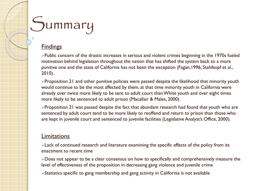 Summary Findings Public concern of the drastic increases in serious and violent crimes beginning in the 1970s fueled motivation behind legislation throughout the nation that has shifted the system back to a more punitive one and the state of California has not been the exception (Fagan,1996; Stahlkopf et al., 2010). Proposition 21 and other punitive policies were passed despite the likelihood that minority youth would continue to be the most affected by them, at that time minority youth in California were already over twice more likely to be sent to adult court than White youth and over eight times more likely to be sentenced to adult prison (Macallair & Males, 2000). Proposition 21 was passed despite the fact that abundant research had found that youth who are sentenced by adult court tend to be more likely to reoffend and return to prison than those who are kept in juvenile court and sentenced to juvenile facilities (Legislative Analyst’s Office, 2000). Limitations Lack of continued research and literature examining the specific effects of the policy from its enactment to recent time Does not appear to be a clear consensus on how to specifically and comprehensively measure the level of effectiveness of the proposition in decreasing gang violence and juvenile crime Statistics specific to gang membership and gang activity in California is not available