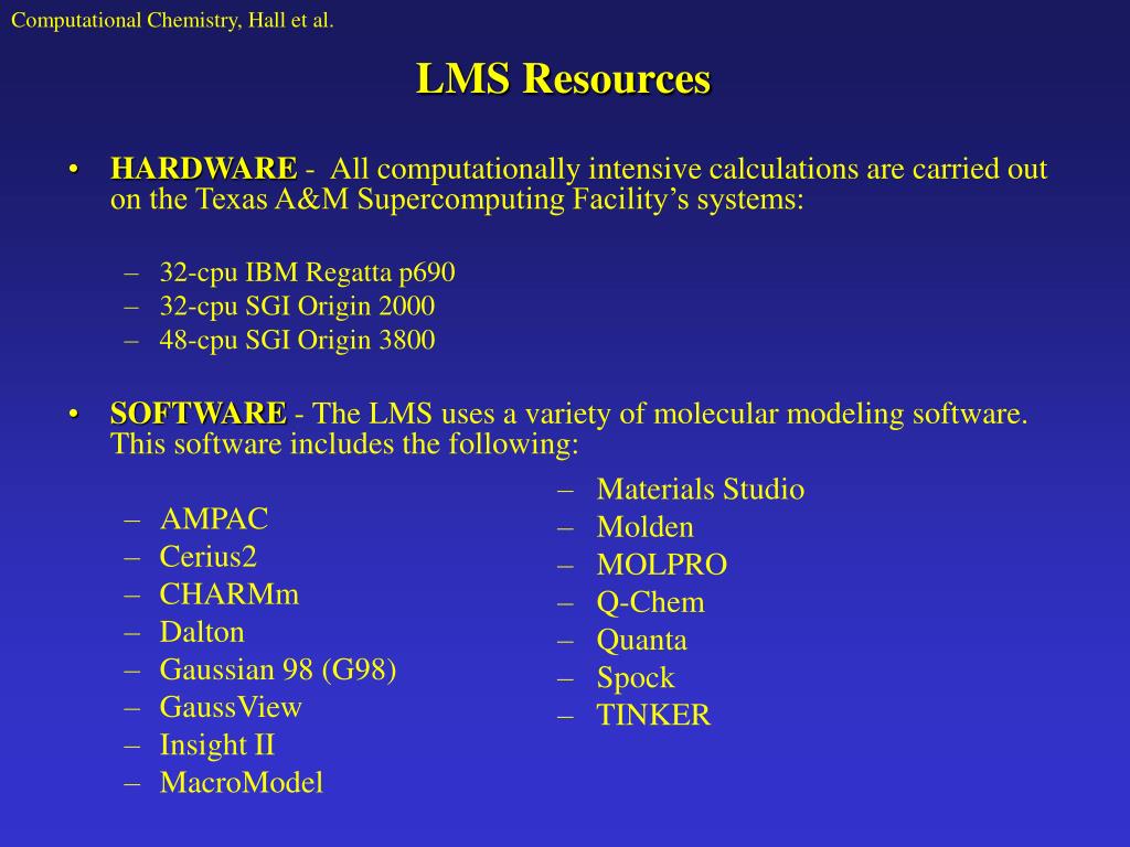 Computational Chemistry, Hall et al. LMS Resources • HARDWARE - All computationally intensive calculations are carried out on the Texas A&M Supercomputing Facility’s systems: • 32-cpu IBM Regatta p690 • 32-cpu SGI Origin 2000 • 48-cpu SGI Origin 3800 • SOFTWARE - The LMS uses a variety of molecular modeling software. This software includes the following: • AMPAC • Cerius2 • CHARMm • Dalton • Gaussian 98 (G98) • GaussView • Insight II • MacroModel • Materials Studio • Molden • MOLPRO • Q-Chem • Quanta • Spock • TINKER