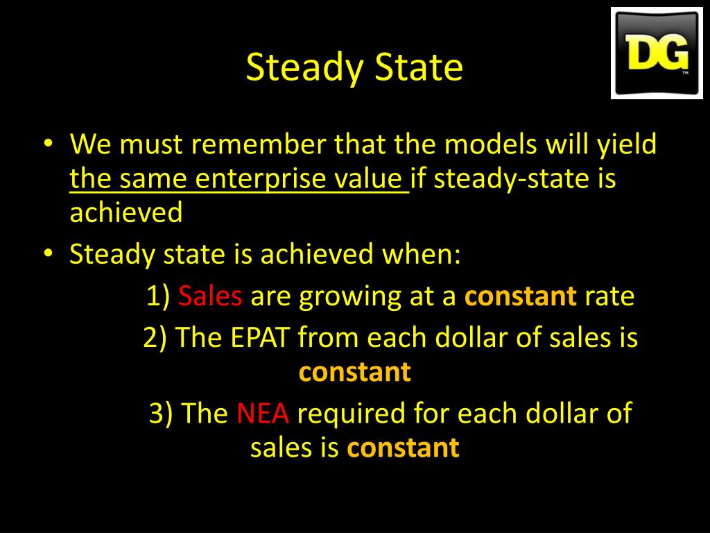 Steady State • We must remember that the models will yield the same enterprise value if steady-state is achieved • Steady state is achieved when: 1) Sales are growing at a constant rate 2) The EPAT from each dollar of sales is constant 3) The NEA required for each dollar of sales is constant