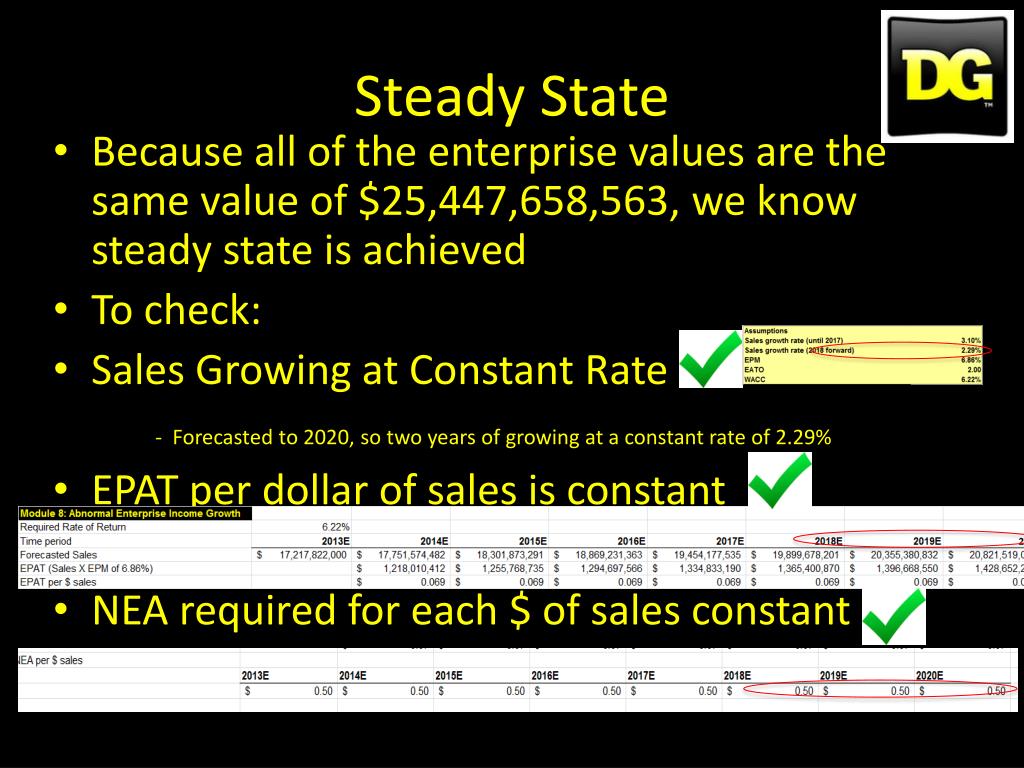 Steady State • Because all of the enterprise values are the same value of $25,447,658,563, we know steady state is achieved • To check: • Sales Growing at Constant Rate -Forecasted to 2020, so two years of growing at a constant rate of 2.29% • EPAT per dollar of sales is constant • NEA required for each $ of sales constant