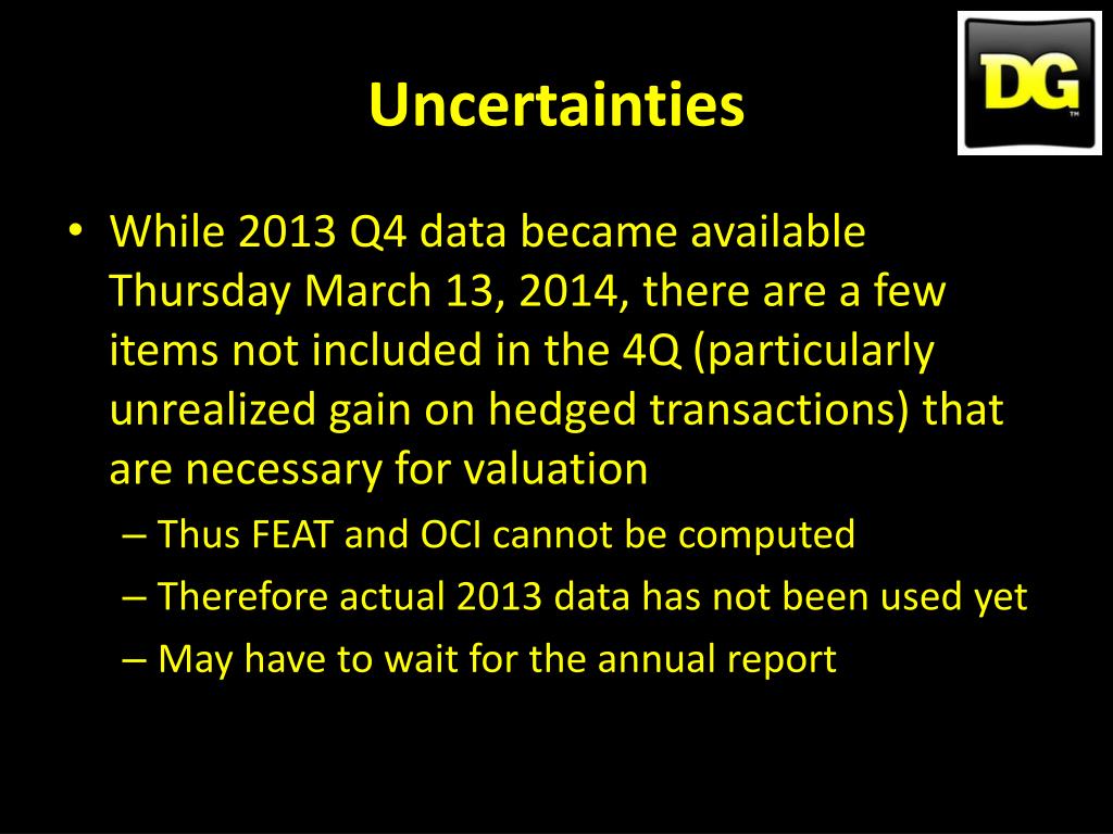 Uncertainties • While 2013 Q4 data became available Thursday March 13, 2014, there are a few items not included in the 4Q (particularly unrealized gain on hedged transactions) that are necessary for valuation • Thus FEAT and OCI cannot be computed • Therefore actual 2013 data has not been used yet • May have to wait for the annual report