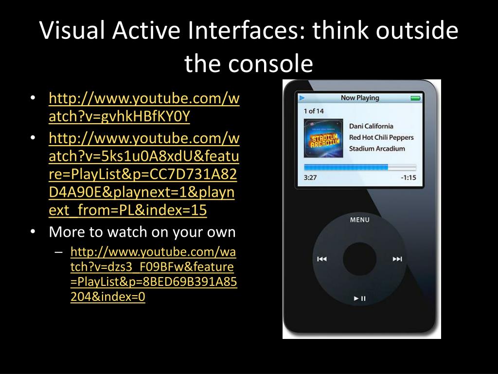 Visual Active Interfaces: think outside the console • http://www.youtube.com/watch?v=gvhkHBfKY0Y • http://www.youtube.com/watch?v=5ks1u0A8xdU&feature=PlayList&p=CC7D731A82D4A90E&playnext=1&playnext_from=PL&index=15 • More to watch on your own • http://www.youtube.com/watch?v=dzs3_F09BFw&feature=PlayList&p=8BED69B391A85204&index=0