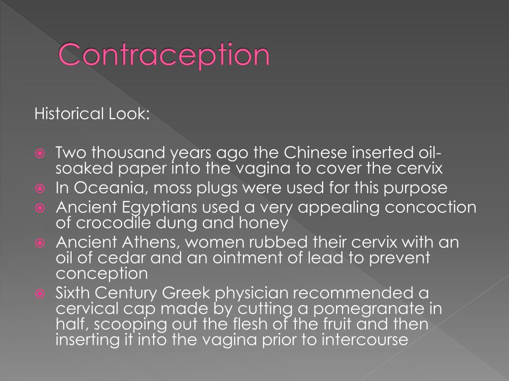 Contraception Historical Look: • Two thousand years ago the Chinese inserted oil-soaked paper into the vagina to cover the cervix • In Oceania, moss plugs were used for this purpose • Ancient Egyptians used a very appealing concoction of crocodile dung and honey • Ancient Athens, women rubbed their cervix with an oil of cedar and an ointment of lead to prevent conception • Sixth Century Greek physician recommended a cervical cap made by cutting a pomegranate in half, scooping out the flesh of the fruit and then inserting it into the vagina prior to intercourse