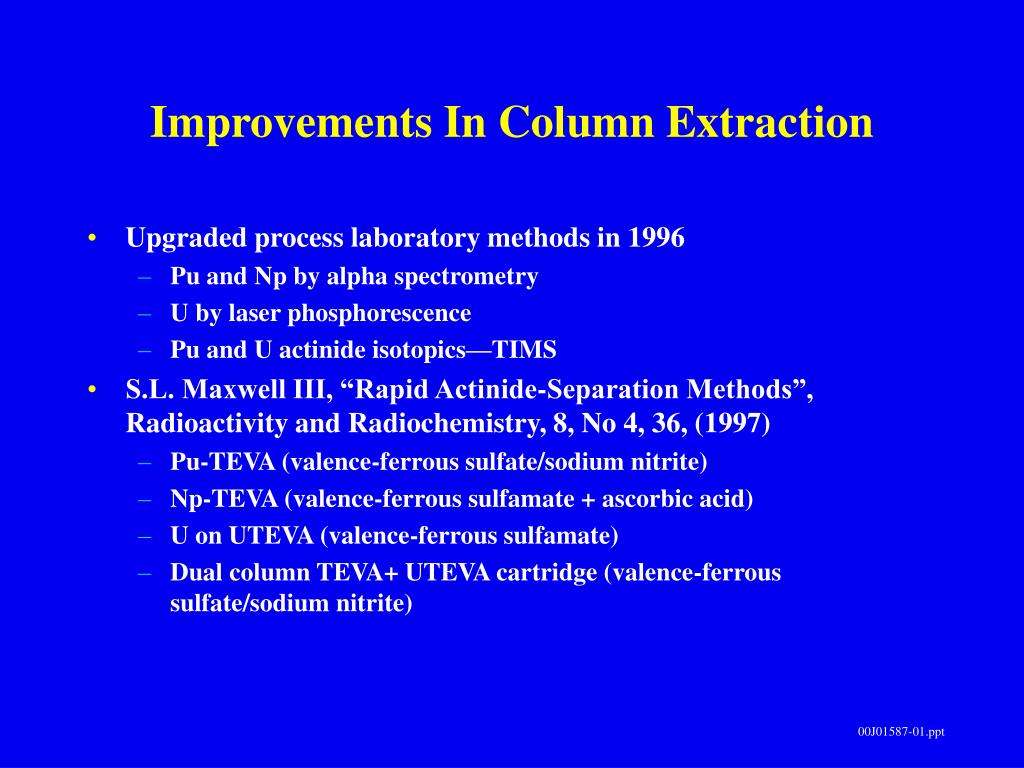 Improvements In Column Extraction • Upgraded process laboratory methods in 1996 • Pu and Np by alpha spectrometry • U by laser phosphorescence • Pu and U actinide isotopics—TIMS • S.L. Maxwell III, “Rapid Actinide-Separation Methods”, Radioactivity and Radiochemistry, 8, No 4, 36, (1997) • Pu-TEVA (valence-ferrous sulfate/sodium nitrite) • Np-TEVA (valence-ferrous sulfamate + ascorbic acid) • U on UTEVA (valence-ferrous sulfamate) • Dual column TEVA+ UTEVA cartridge (valence-ferrous sulfate/sodium nitrite)