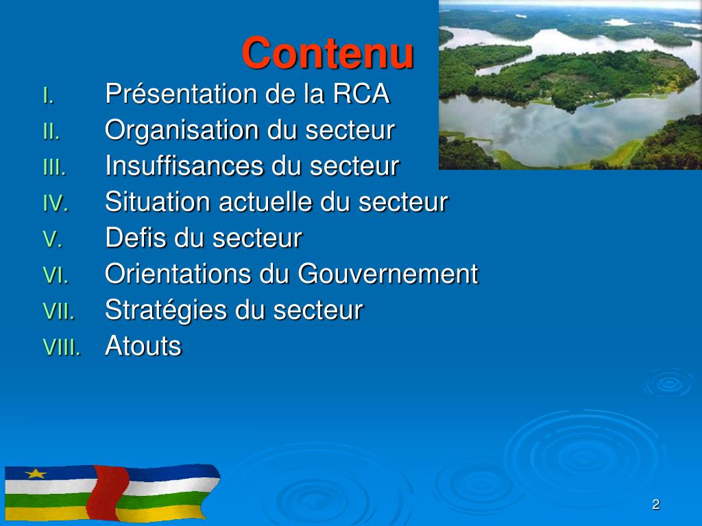 Contenu • Présentation de la RCA • Organisation du secteur • Insuffisances du secteur • Situation actuelle du secteur • Defis du secteur • Orientations du Gouvernement • Stratégies du secteur • Atouts