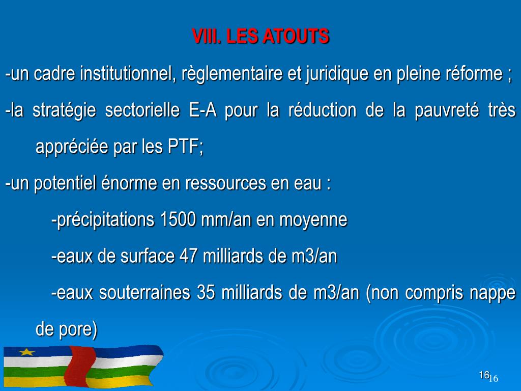VII. LES STRATEGIES DE MISE EN ŒUVRE (suite) -Elaborer le Plan d’Action National de Gestion Intégrée des Ressources en Eau (PANGIRE). -Réduire les risques liés à l’eau et mettre en œuvre des mesures préventives pour les situations de crises ; -Elaborer les critères de planification pour l’alimentation en eau potable et l’assainissement de base en milieu urbain et rural ; -Promouvoir le partenariat public - privé ; -Promouvoir l’assainissement de base en milieu rural comme préalable à la réalisation d’un point d’eau moderne.