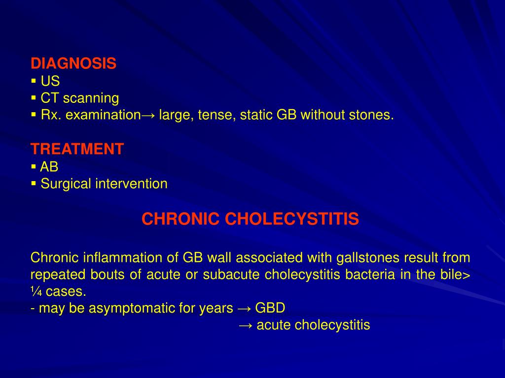 DIAGNOSIS • US • CT scanning • Rx. examination→ large, tense, static GB without stones. • TREATMENT • AB • Surgical intervention • CHRONIC CHOLECYSTITIS • Chronic inflammation of GB wall associated with gallstones result from repeated bouts of acute or subacute cholecystitis bacteria in the bile> ¼ cases. • - may be asymptomatic for years → GBD • → acute cholecystitis