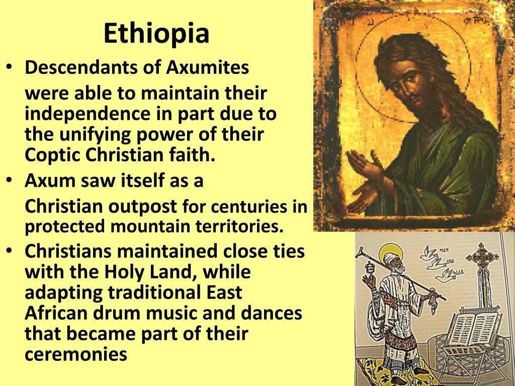 Ethiopia • Descendants of Axumites were able to maintain their independence in part due to the unifying power of their Coptic Christian faith. • Axum saw itself as a Christian outpost for centuries in protected mountain territories. • Christians maintained close ties with the Holy Land, while adapting traditional East African drum music and dances that became part of their ceremonies