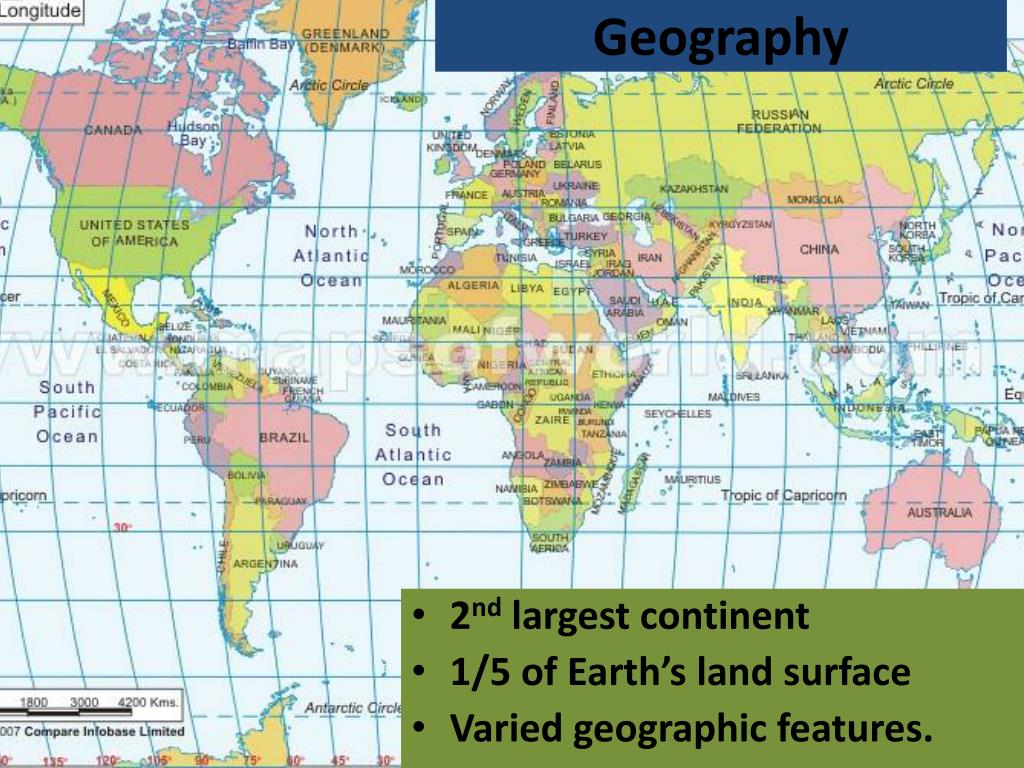 Geography • 2nd largest continent • 1/5 of Earth’s land surface • Varied geographic features.