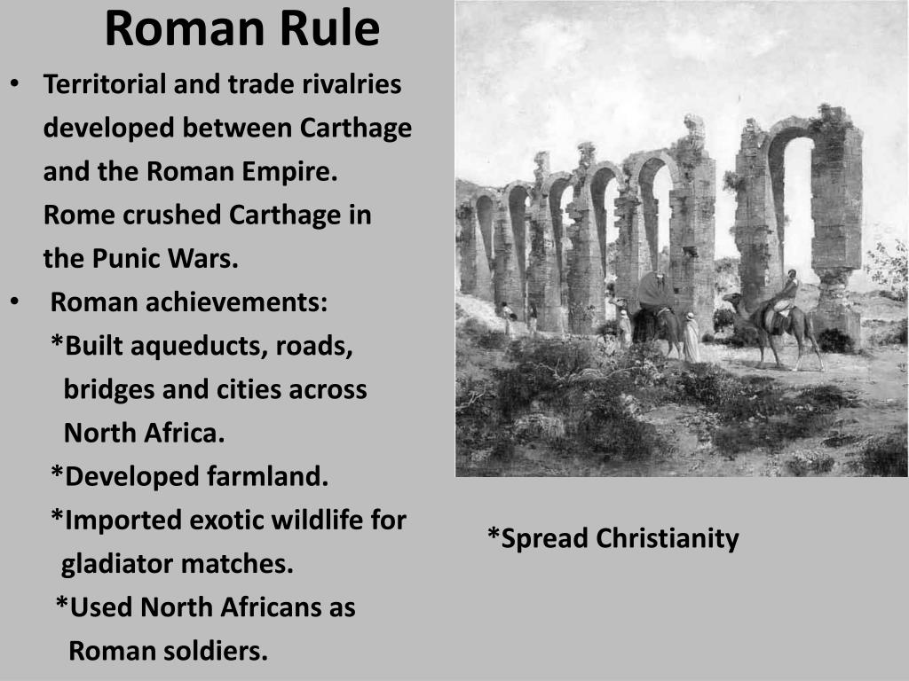 Roman Rule • Territorial and trade rivalries developed between Carthage and the Roman Empire. Rome crushed Carthage in the Punic Wars. • Roman achievements: *Built aqueducts, roads, bridges and cities across North Africa. *Developed farmland. *Imported exotic wildlife for gladiator matches. *Used North Africans as Roman soldiers. • *Spread Christianity