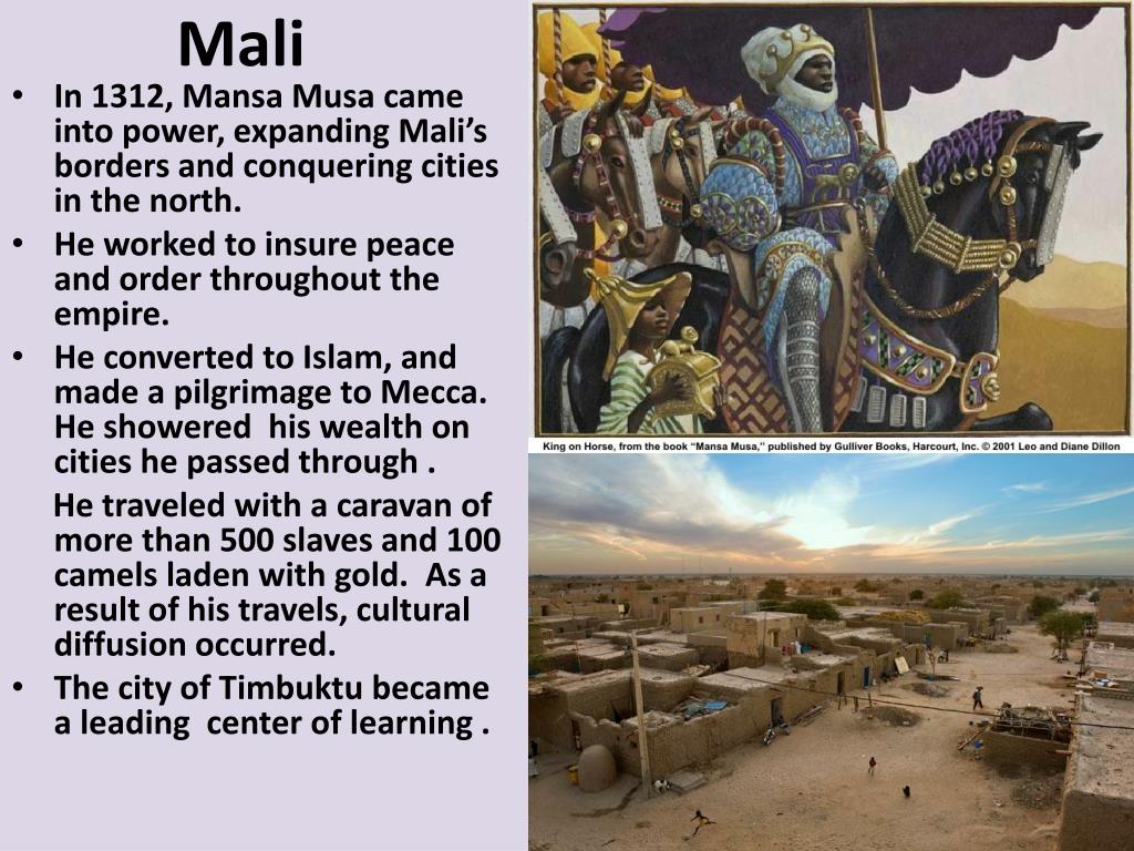 Mali • In 1312, Mansa Musa came into power, expanding Mali’s borders and conquering cities in the north. • He worked to insure peace and order throughout the empire. • He converted to Islam, and made a pilgrimage to Mecca. He showered his wealth on cities he passed through . He traveled with a caravan of more than 500 slaves and 100 camels laden with gold. As a result of his travels, cultural diffusion occurred. • The city of Timbuktu became a leading center of learning .