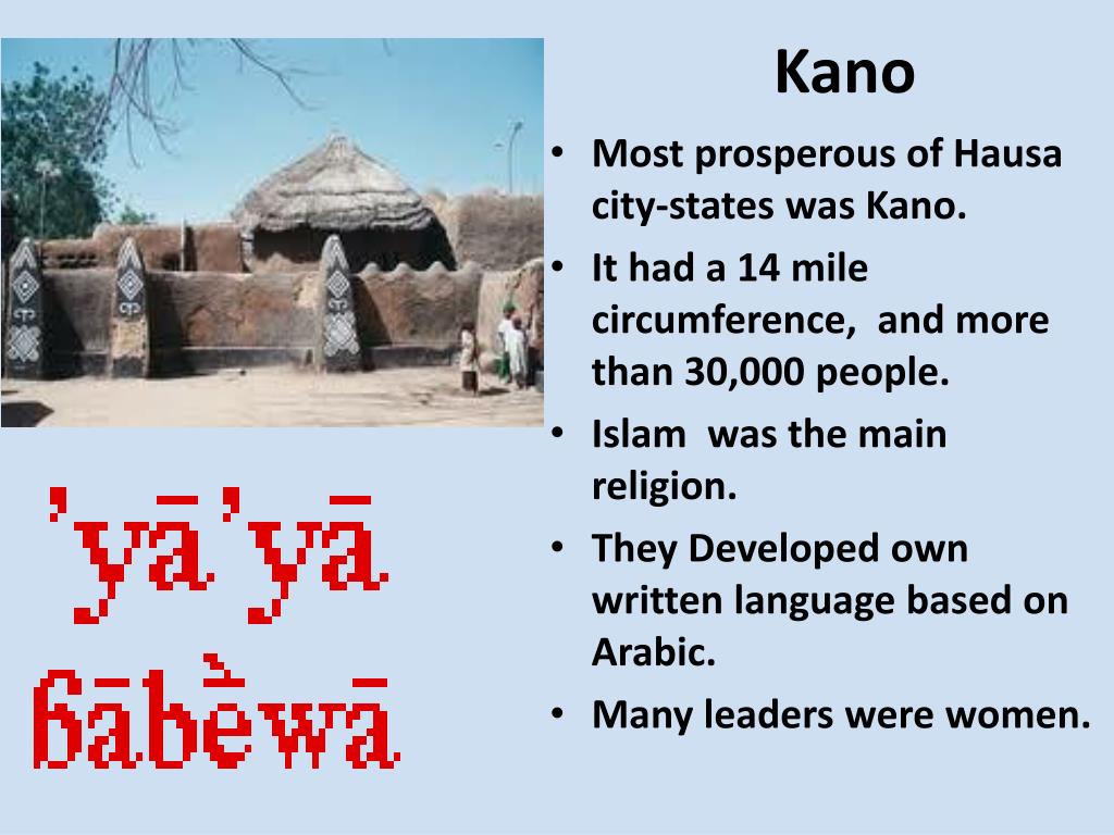 Kano • Most prosperous of Hausa city-states was Kano. • It had a 14 mile circumference, and more than 30,000 people. • Islam was the main religion. • They Developed own written language based on Arabic. • Many leaders were women.