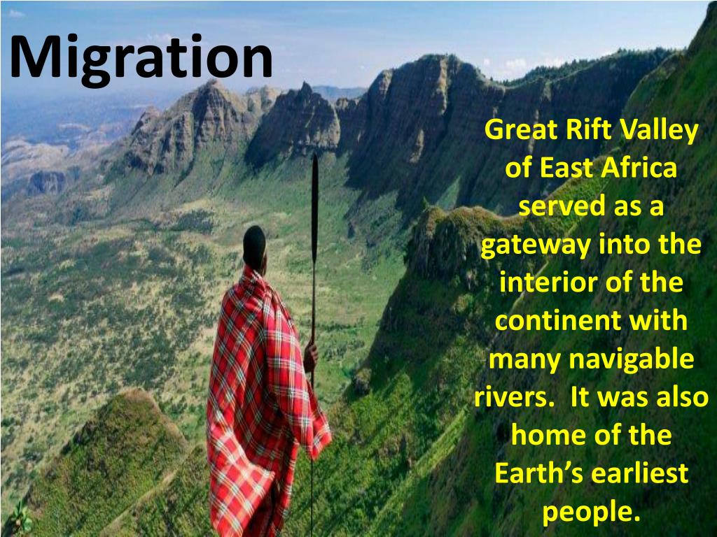 Migration Great Rift Valley of East Africa served as a gateway into the interior of the continent with many navigable rivers. It was also home of the Earth’s earliest people.