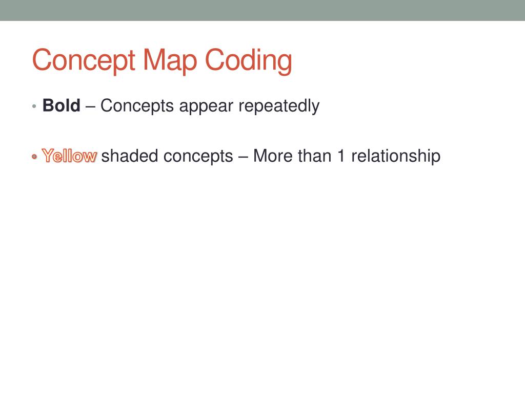 Concept Map Coding • Bold – Concepts appear repeatedly • Yellow shaded concepts – More than 1 relationship
