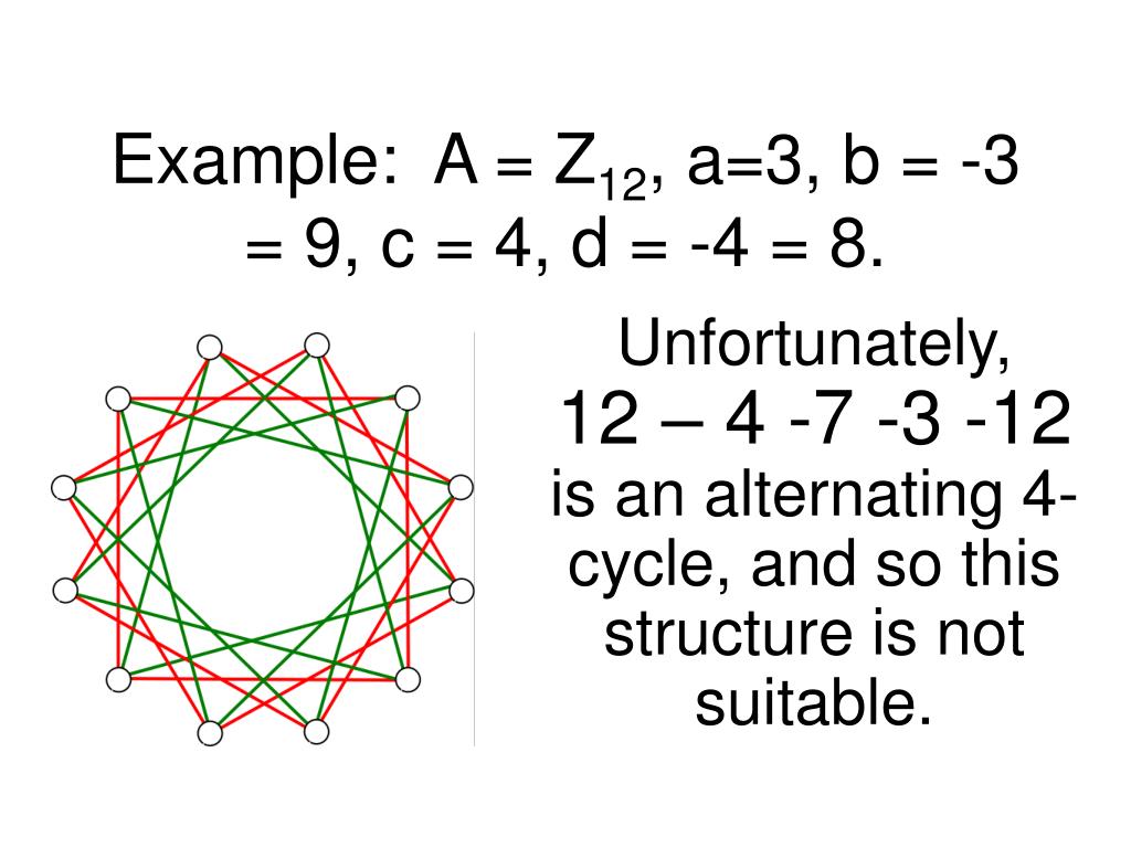 Example: A = Z12, a=3, b = -3 = 9, c = 4, d = -4 = 8. Unfortunately, 12 – 4 -7 -3 -12 is an alternating 4-cycle, and so this structure is not suitable.