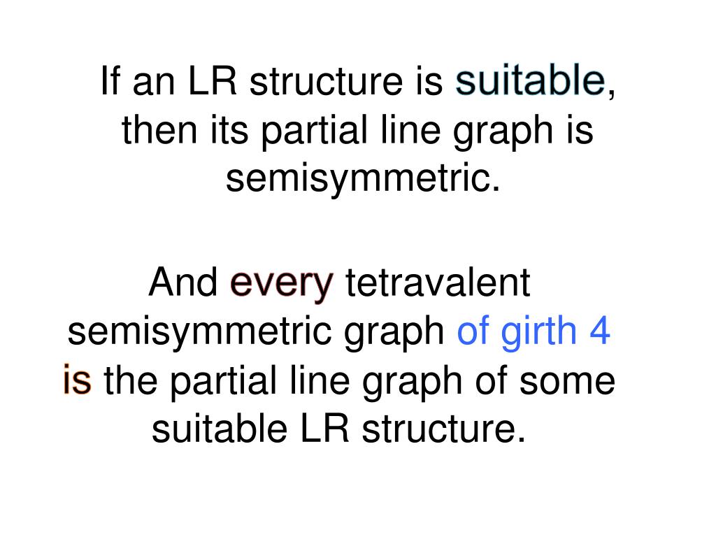 If an LR structure is suitable, then its partial line graph issemisymmetric. And every tetravalent semisymmetric graph of girth 4 is the partial line graph of some suitable LR structure.