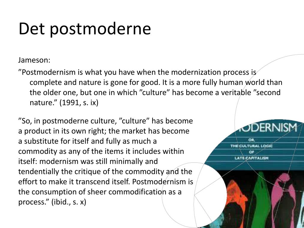 Det postmoderne Jameson: ”Postmodernism is whatyou have when the modernizationprocess is complete and nature is gone for good. It is a more fully human worldthan the olderone, but one in which ”culture” has become a veritable ”second nature.” (1991, s. ix) ”So, in postmoderne culture, ”culture” has become a product in itsown right; the market has become a substitute for itself and fully as much a commodity as any of the items it includeswithinitself: modernismwas still minimally and tendentially the critique of the commodity and the effort to make it transcenditself. Postmodernism is the consumption of sheercommodification as a process.” (ibid., s. x)
