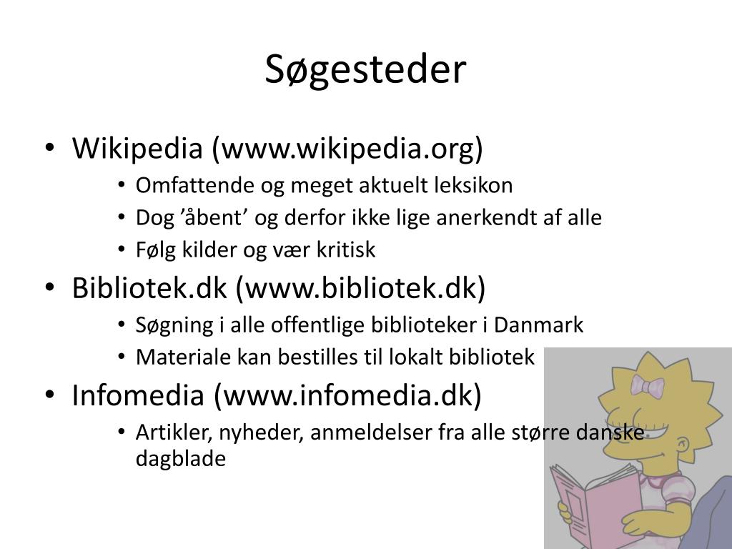 Søgesteder • Wikipedia (www.wikipedia.org) • Omfattende og meget aktuelt leksikon • Dog ’åbent’ og derfor ikke lige anerkendt af alle • Følg kilder og vær kritisk • Bibliotek.dk (www.bibliotek.dk) • Søgning i alle offentlige biblioteker i Danmark • Materiale kan bestilles til lokalt bibliotek • Infomedia (www.infomedia.dk) • Artikler, nyheder, anmeldelser fra alle større danske dagblade
