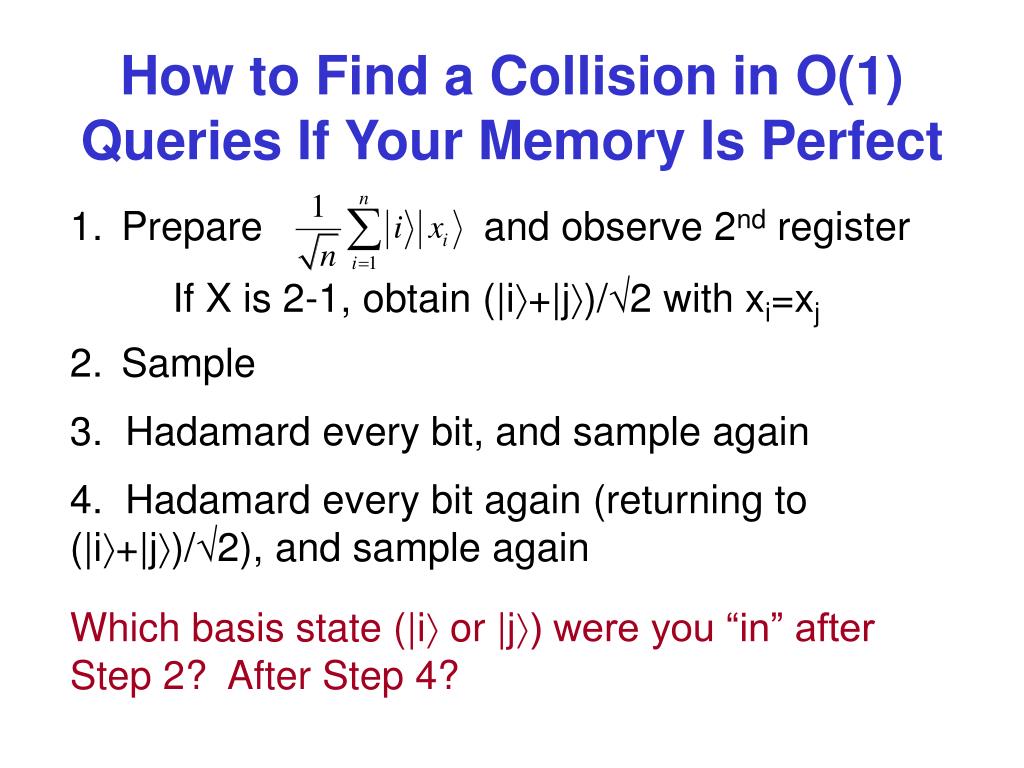 Prepare and observe 2nd register • If X is 2-1, obtain (|i+|j)/2 with xi=xj How to Find a Collision in O(1) Queries If Your Memory Is Perfect • Sample 3. Hadamard every bit, and sample again 4. Hadamard every bit again (returning to (|i+|j)/2), and sample again Which basis state (|i or |j) were you “in” after Step 2? After Step 4?