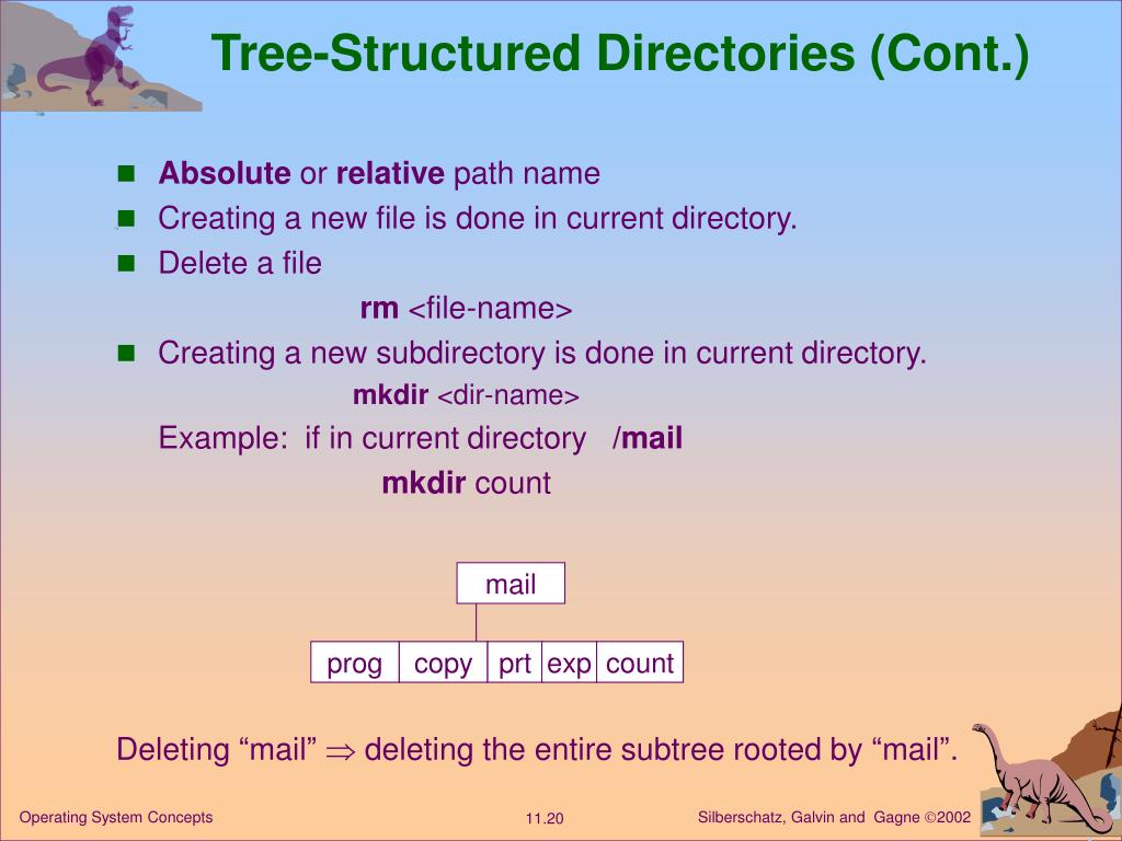 Tree-Structured Directories (Cont.) • Absolute or relative path name • Creating a new file is done in current directory. • Delete a file rm <file-name> • Creating a new subdirectory is done in current directory. mkdir <dir-name> Example: if in current directory /mail mkdir count mail prog copy prt exp count Deleting “mail” deleting the entire subtree rooted by “mail”. Operating System Concepts