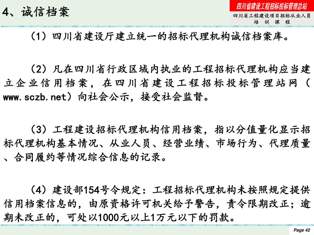 4、诚信档案 (1)四川省建设厅建立统一的招标代理机构诚信档案库。 (2)凡在四川省行政区域内执业的工程招标代理机构应当建立企业信用档案,在四川省建设工程招标投标管理站网(www.sczb.net)向社会公示,接受社会监督。 (3)工程建设招标代理机构信用档案,指以分值量化显示招标代理机构基本情况、从业人员、经营业绩、市场行为、代理质量、合同履约等情况综合信息的记录。 (4)建设部154号令规定:工程招标代理机构未按照规定提供信用档案信息的,由原资格许可机关给予警告,责令限期改正;逾期未改正的,可处以1000元以上1万元以下的罚款。