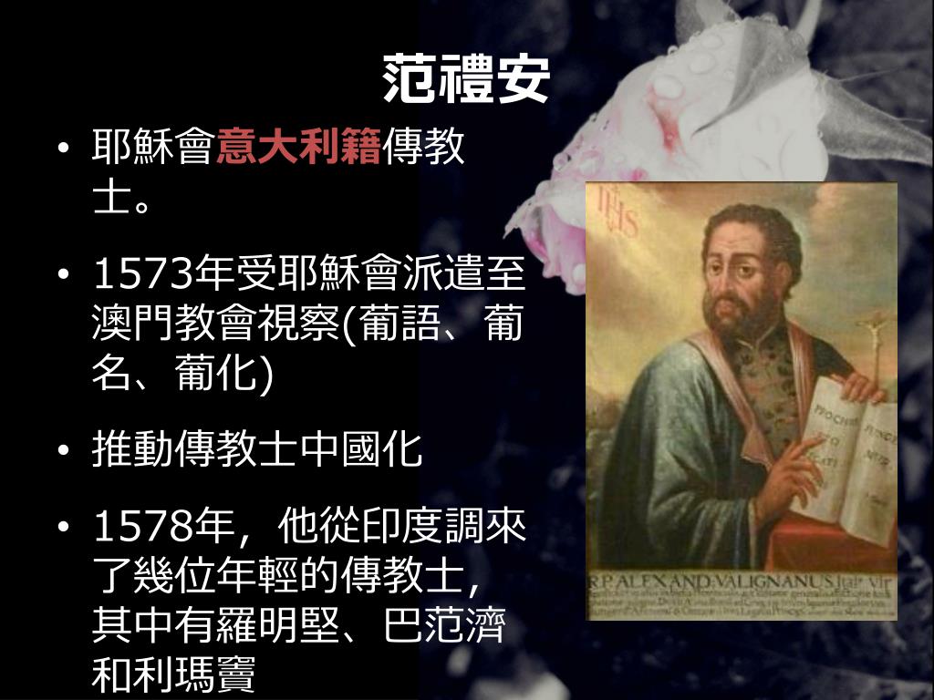 范禮安 • 耶穌會意大利籍傳教士。 • 1573年受耶穌會派遣至澳門教會視察(葡語、葡名、葡化) • 推動傳教士中國化 • 1578年,他從印度調來了幾位年輕的傳教士,其中有羅明堅、巴范濟和利瑪竇