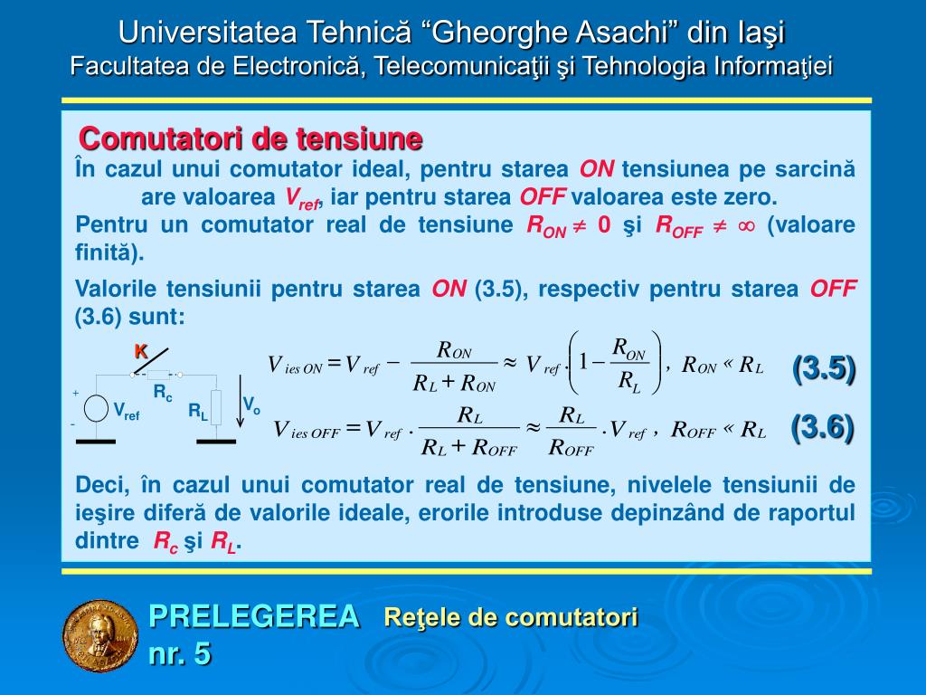 K Rc + Vo Vref RL - (3.4) Universitatea Tehnică “Gheorghe Asachi” din Iaşi Facultatea de Electronică, Telecomunicaţii şi Tehnologia Informaţiei Comutatori de tensiune În general valoarea tensiunii de pe rezistenţa de sarcină este dată de relaţia (3.4): unde Rc reprezintă valoarea rezistenţei comutatorului. PRELEGEREA nr.5 Reţele de comutatori