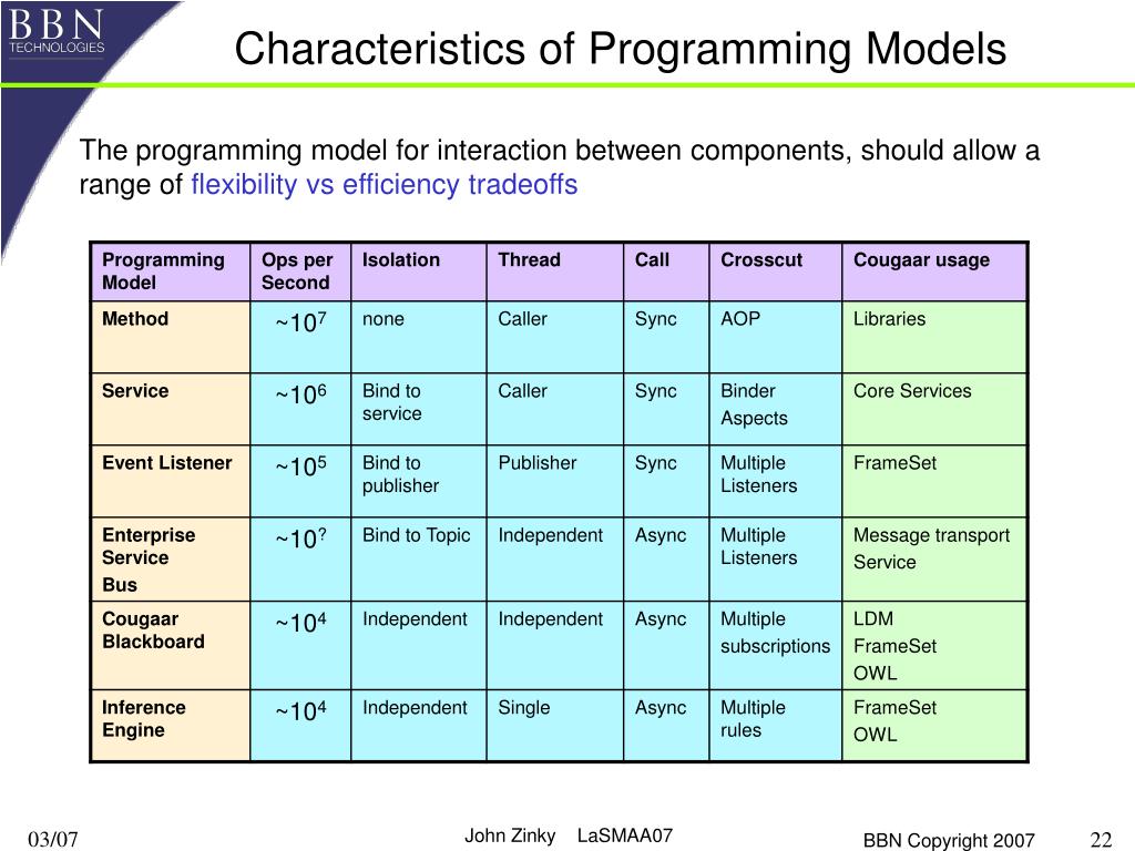 Characteristics of Programming Models The programming model for interaction between components, should allow a range of flexibility vs efficiency tradeoffs