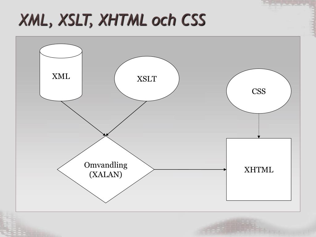XML, XSLT, XHTML och CSS XML XSLT CSS Omvandling (XALAN) XHTML