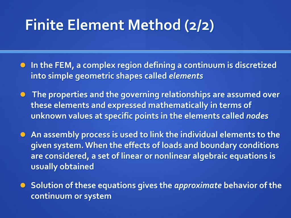 Finite Element Method (2/2) • In the FEM, a complex region defining a continuum is discretized into simple geometric shapes called elements • The properties and the governing relationships are assumed over these elements and expressed mathematically in terms of unknown values at specific points in the elements called nodes • An assembly process is used to link the individual elements to the given system. When the effects of loads and boundary conditions are considered, a set of linear or nonlinear algebraic equations is usually obtained • Solution of these equations gives the approximate behavior of the continuum or system