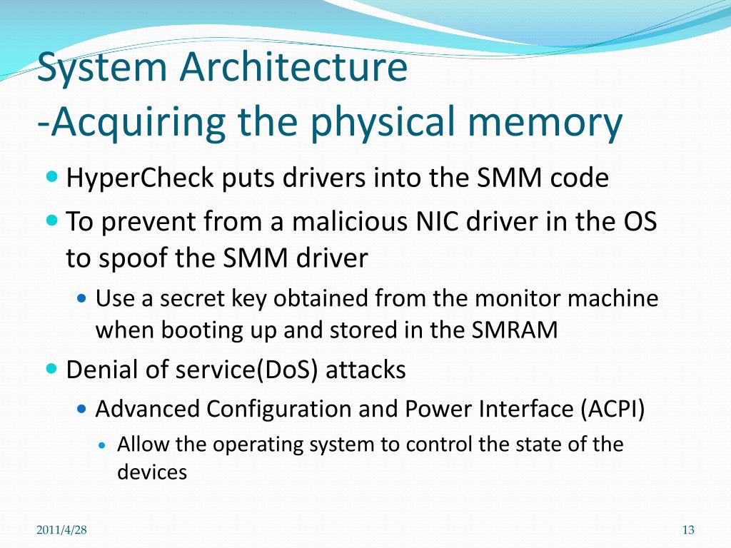 System Architecture-Acquiring the physical memory • HyperCheck puts drivers into the SMM code • To prevent from a malicious NIC driver in the OS to spoof the SMM driver • Use a secret key obtained from the monitor machine when booting up and stored in the SMRAM • Denial of service(DoS) attacks • Advanced Configuration and Power Interface (ACPI) • Allow the operating system to control the state of the devices