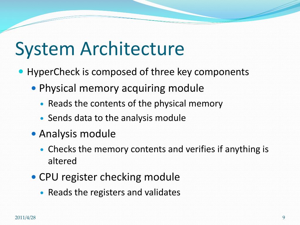 System Architecture • HyperCheck is composed of three key components • Physical memory acquiring module • Reads the contents of the physical memory • Sends data to the analysis module • Analysis module • Checks the memory contents and verifies if anything is altered • CPU register checking module • Reads the registers and validates